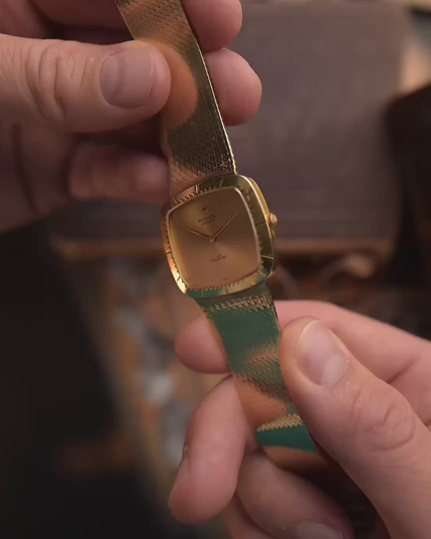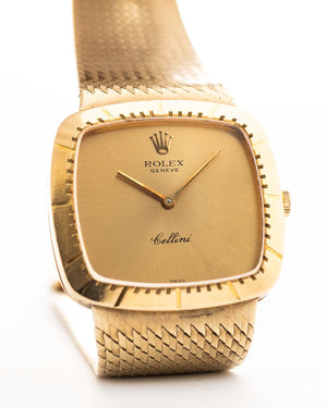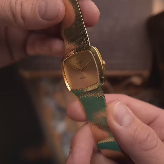 Die Rolex Cellini Linie zeigt die elegantere Seite von Rolex im Vergleich zu seinen bekannteren Sportmodellen. Diese Version ist in ein quadratisches Gehäuse aus 14k-Gelbgold mit einem ovalen Passepartout für das Zifferblatt eingepasst, was für...