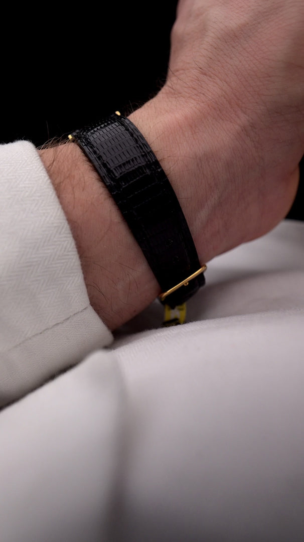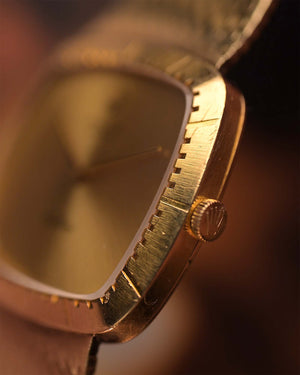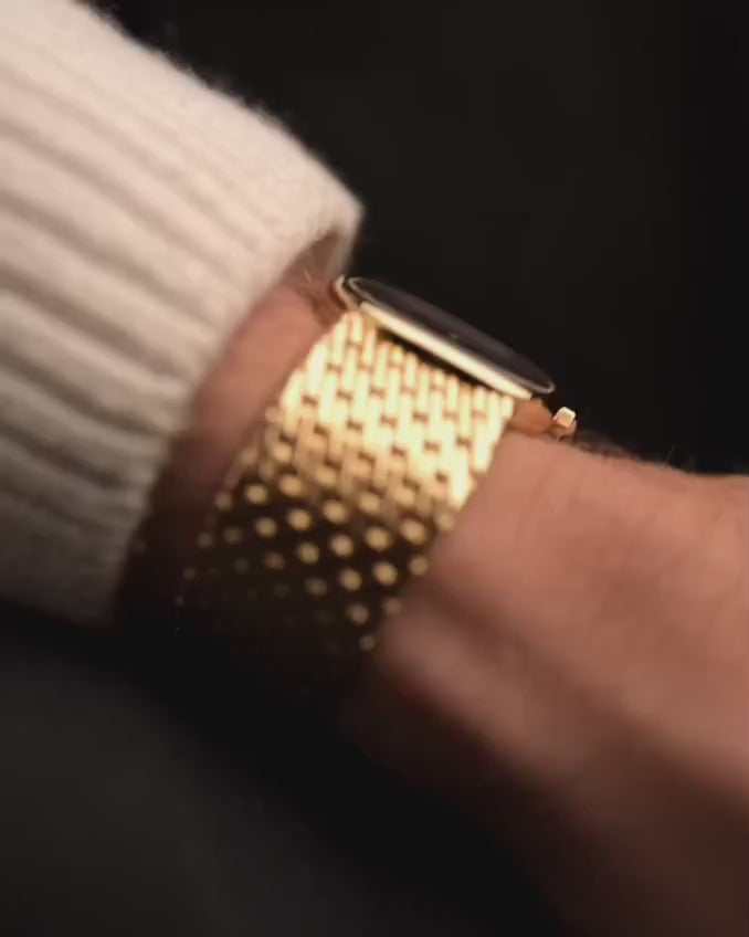 This Piaget took our breath at first sight. These geometric forms combined with the forged 18k yellow gold bracelet, Lapislazuli dial, alpha handset and classic Piaget logo are true art.Launched in 1957, the 9P caliber...
