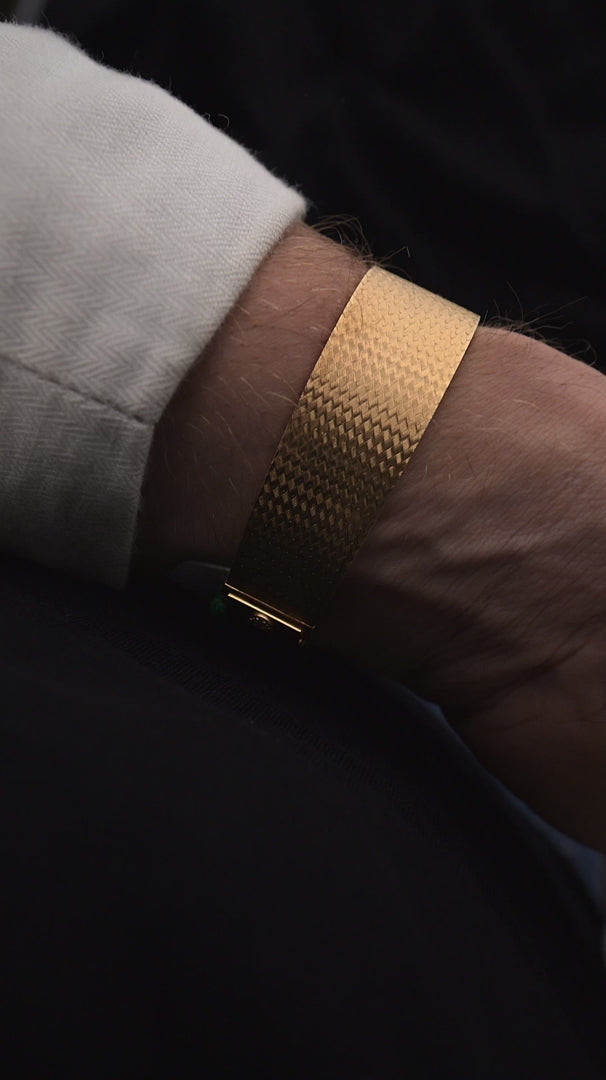 This Piaget took our breath at first sight. These geometric forms combined with the forged 18k yellow gold bracelet, Lapislazuli dial, alpha handset and classic Piaget logo are true art.Launched in 1957, the 9P caliber...