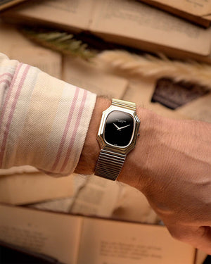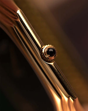The deep black onyx dial, paired with gold hands and an onyx cabochon crown, exudes understated luxury. Powered by the hand-wound Caliber 177, it’s a rare and highly collectible model ideal for enthusiasts of vintage design and hard stone dials.