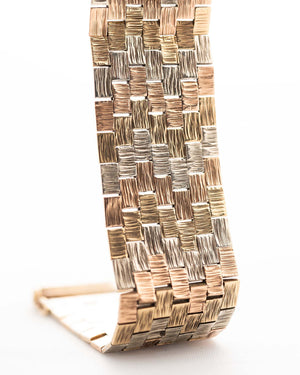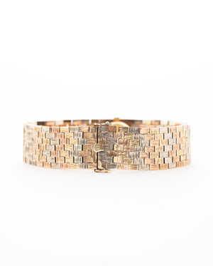 This particular model is distinguished by its rare Trinity 9 carat gold bracelet, an exquisite blend of yellow, white, and rose gold links that create a harmonious tri-tone aesthetic—both sophisticated and versatile.