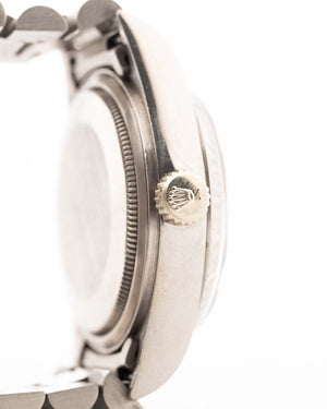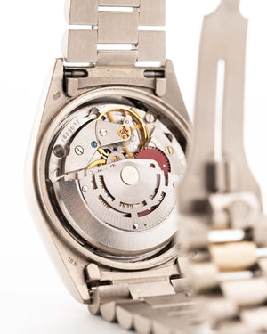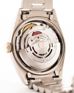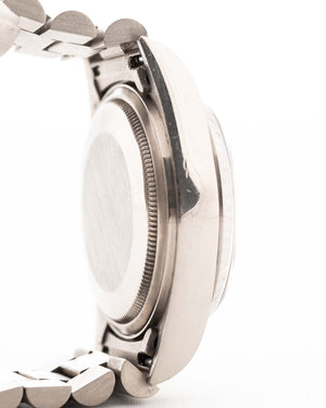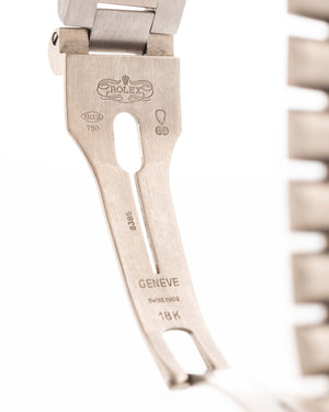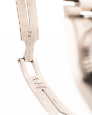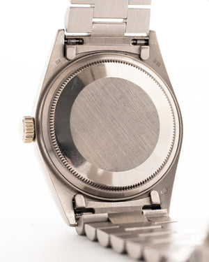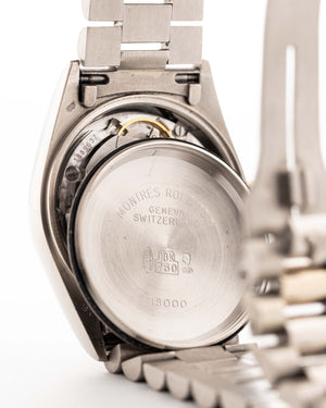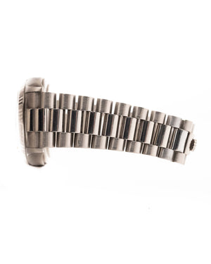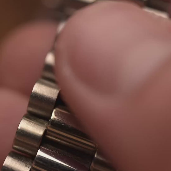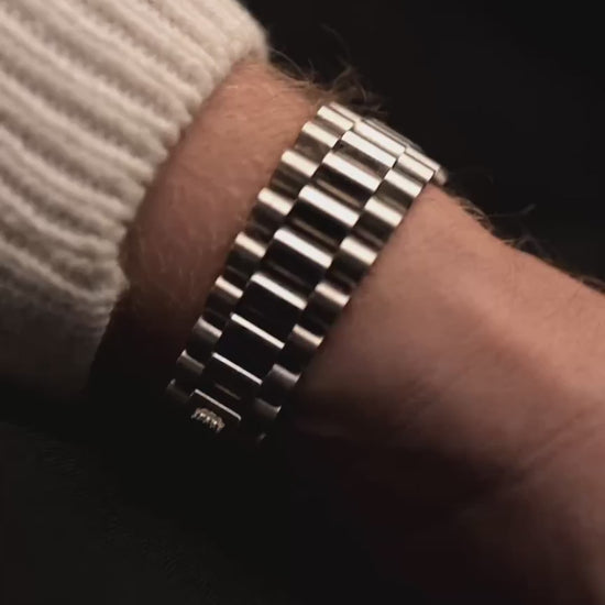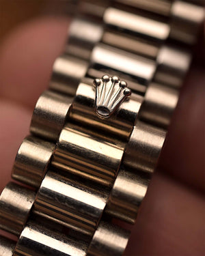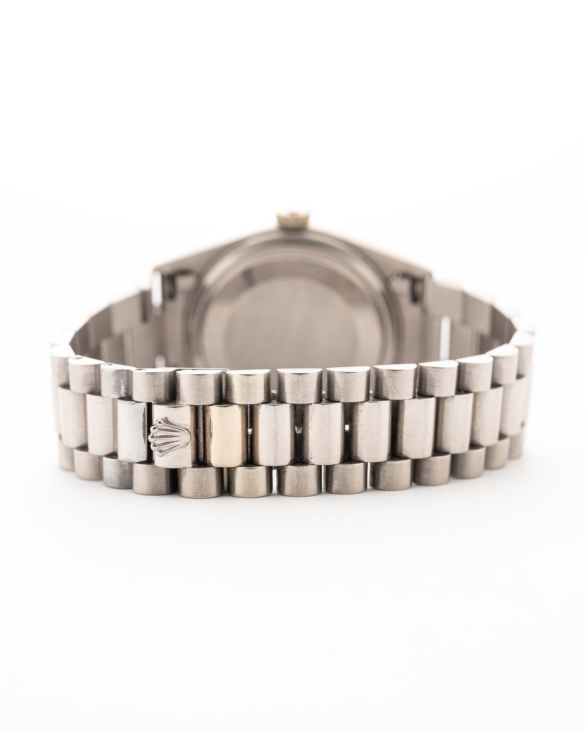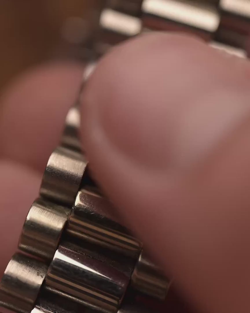 The Rolex Day-Date reference 18039 is a classic example of the brand’s craftsmanship from the 1980s. Made from solid 18k white gold and fitted with the signature President bracelet, the watch carries the unmistakable presence of the Day-Date line. Its 36mm case, fluted bezel, and automatic caliber 3055 movement with quickset date combine reliability with unmistakable design.