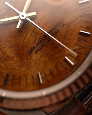 The highlight of this model is the rare wood dial, part of a special series where Rolex experimented with natural materials. Each dial is unique, showing distinct wood grain patterns and warm tonal variations that make every piece one of a kind. The day and date display remain clear and functional, balancing practicality with character.